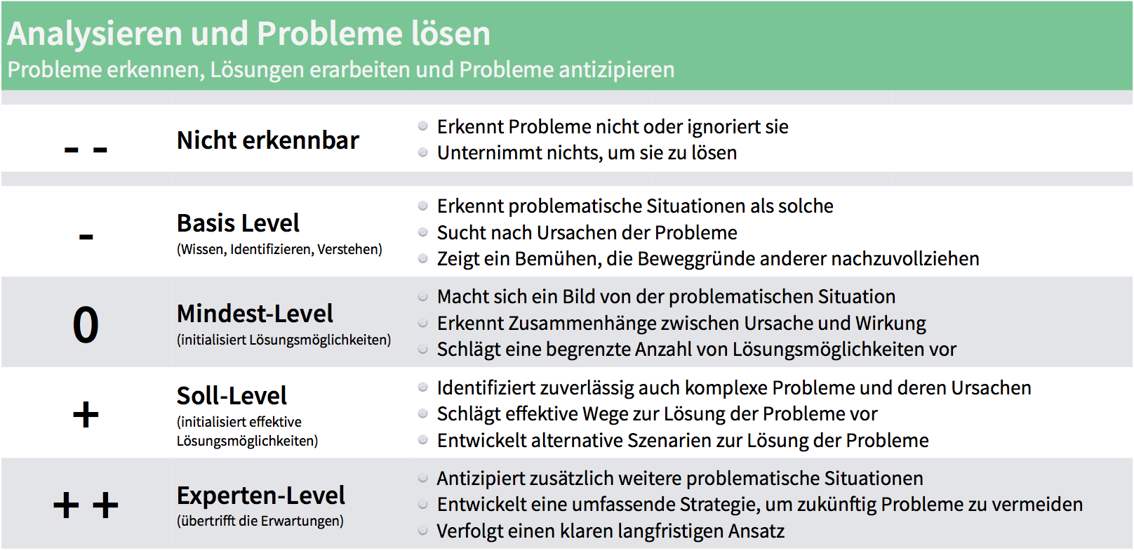 | Eindeutige Entscheidung (z.B. ja, nein, nicht jetzt) | Stärken-/ Schwächenanalyse, persönlicher Entwicklungsplan |