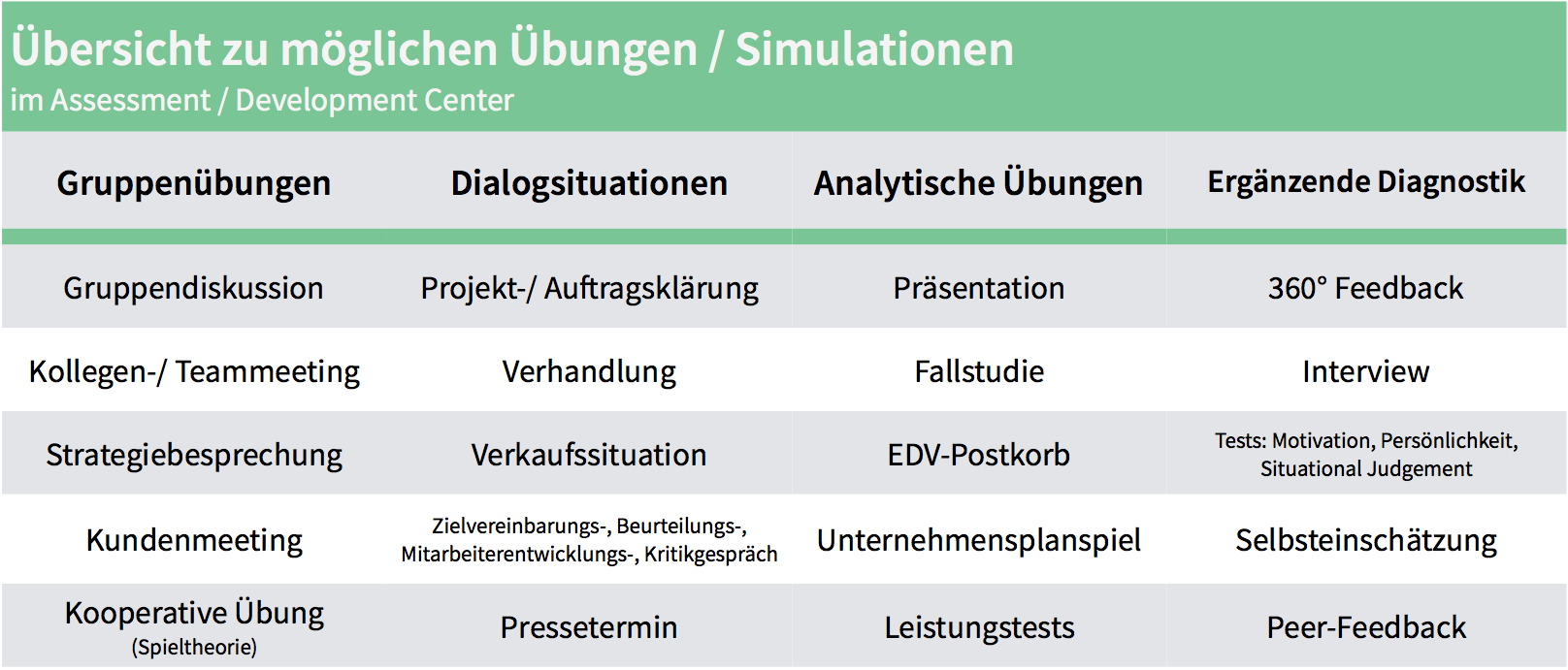 | Ergänzend Testverfahren und Interview | Ergänzend 360° Feedback, Peer-Feedback, Tests, Trainingselemente und Coaching-Interview |