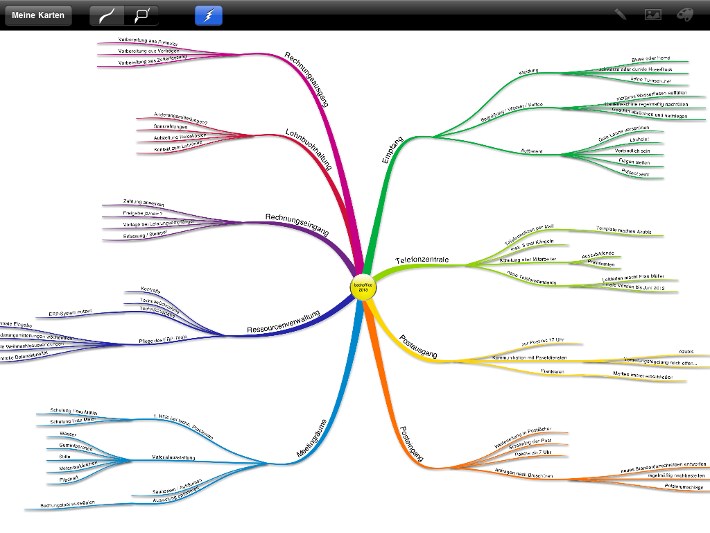 Ich nutze Mind-Maps im Coaching, zum Beispiel im Rahmen der Auftragsklärung und natürlich bei der Arbeit an konkreten inhaltlichen Themen. Denken wir beispielsweise an den Leiter eines Backoffices mit dem Wunsch nach struktureller Optimierung seines Bereiches. Eine Mind-Map kann zum Beipiel den IST-Zustand, also eine umfassende Darstellung aller Tätigkeiten, die in diesem Backoffice zu erledigen sind, abbilden. Aufbauend auf dieser Darstellung können Coach und Coachee alternative Strukturen erstellen und deren Konsequenzen besprechen. Das auf diese Weise visualisierte Ergebnis dient dem Coachee nicht selten für lange Zeit als Zielbild, hängt oft in dessen Büro und erinnert so regelmäßig daran, den erreichten Status Quo mit dem SOLL-Zustand (siehe Screenshot) abzugleichen.