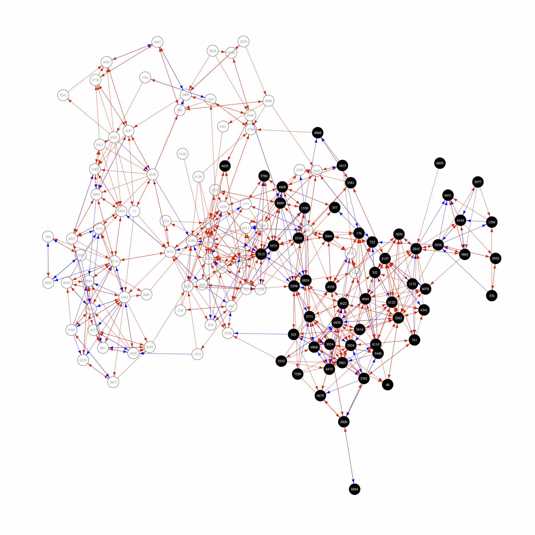 The wild tangle of circles represent the total of 128 recipients of the 360° feedback implementation. The black circles represent the employees of a particular department, while the rest of the company is shown as white circles. The connections between the circles are directed (-> arrows) and tell us, who gives whom feedback. Red Arrows show collegial feedback and blue arrows signify feedback from a customer´s perspective.
